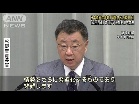 松野官房長官:「ロシアがウクライナ侵略を続ける中で、情勢をさらに緊迫化するものであり、非難します。こうした緊張を高めるような行為を止めるように求めるとともに、今後とも強い関心を持って事態の推移を注視していきます」